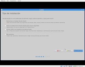 En el Tipo de instalación, el sistema lo que hará es formatear y particionar el disco duro del equipo. Si saben particionar en Linux y quieren hacerlo manualmente seleccionan Mas opciones; O si quieren instalar UbuntuStudio junto con Windows y no desinstalar Windows eligen la opción: Instalar UbuntuStudio junto a Windows que les aparecerá; y si no saben nada de nada, pues dejamos la opción mas fácil por defecto: Borrar todo e instalar UbuntuStudio que lo hará todo por nosotros. Clic en Instalar Ahora.